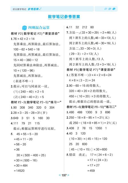 .西南师大版四年级数学下册《状元数学笔记+参考答案》学教
