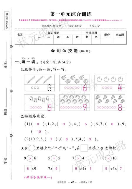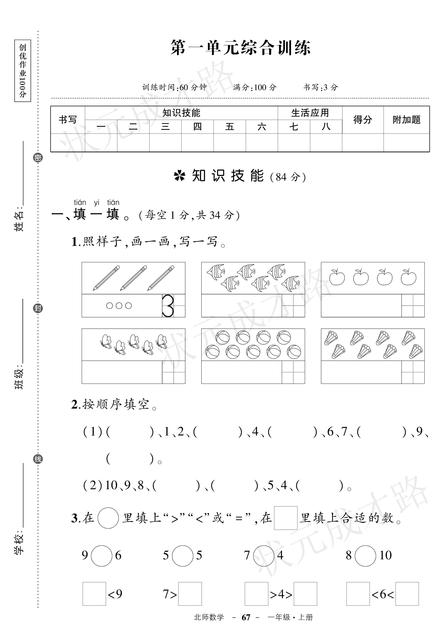 北师版一年级数学上册《创优作业100分.试卷》教用