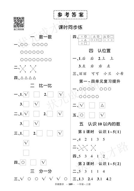 苏教版一年级数学上册《创优作业100分.试卷》教用