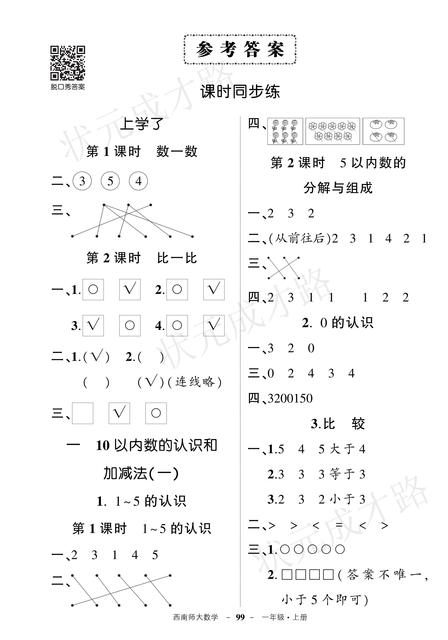 西南师大版一年级数学上册《创优作业100分.试卷》学用