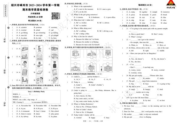 (浙江)PEP6英上100分 试卷 教