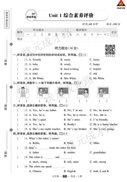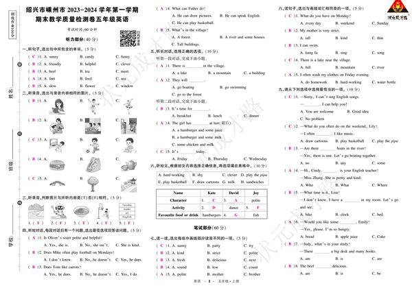 (浙江)PEP5英上100分 试卷 学