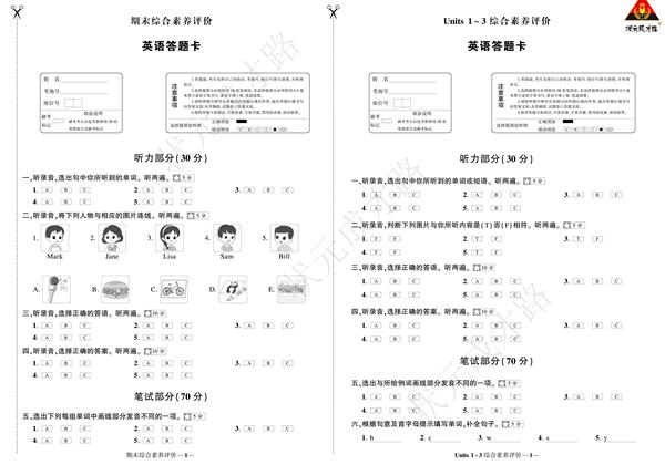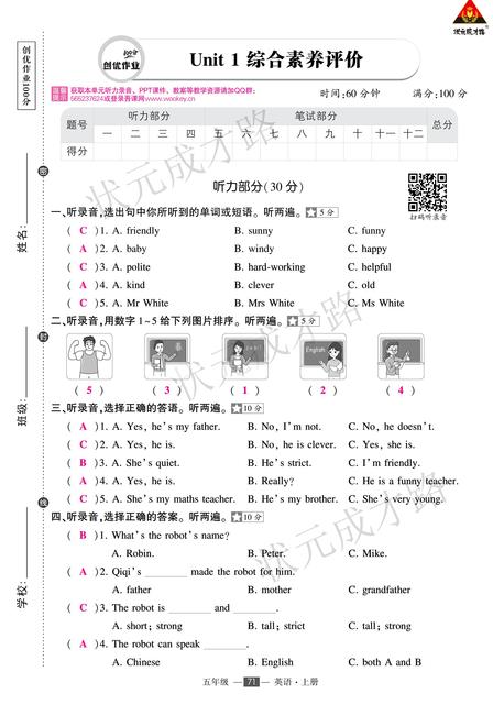 (浙江)PEP5英上100分 答题卡