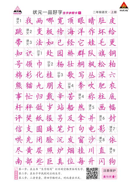 统编版二年级语文上册《状元一品好字 生字参照卡》