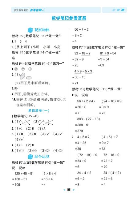 人教版三年级数学上册《状元数学笔记 答案》学教
