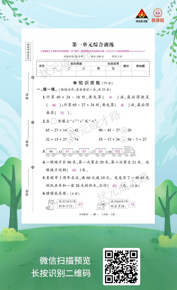 北师版二年级数学上册《创优作业100分.试卷》教用
