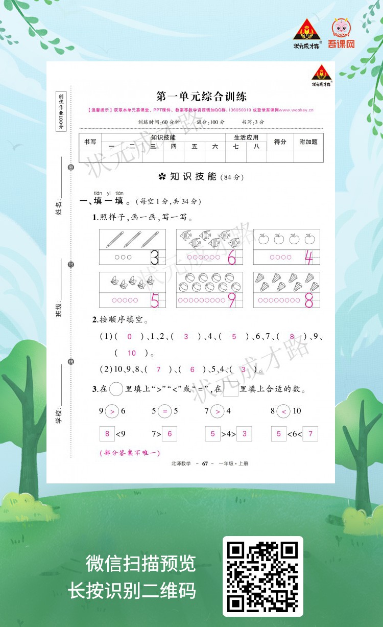 .北师版一年级数学上册《创优作业100分.试卷》教用