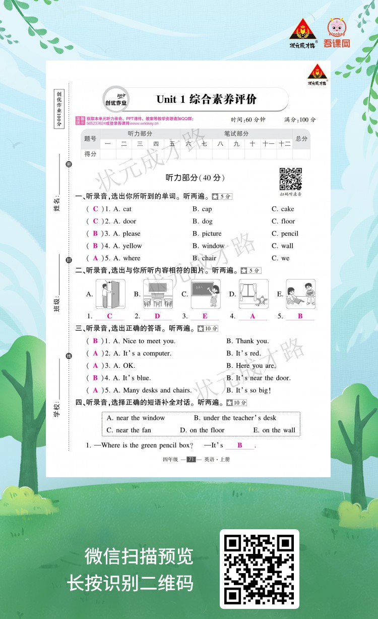 (浙江)人教PEP版四年级英语上册《创优作业100分 试卷》教用
