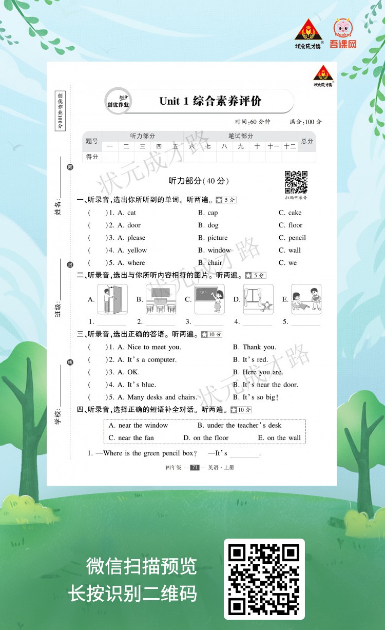 返回书橱 (浙江)人教PEP版四年级英语上册《创优作业100分 试卷》学用