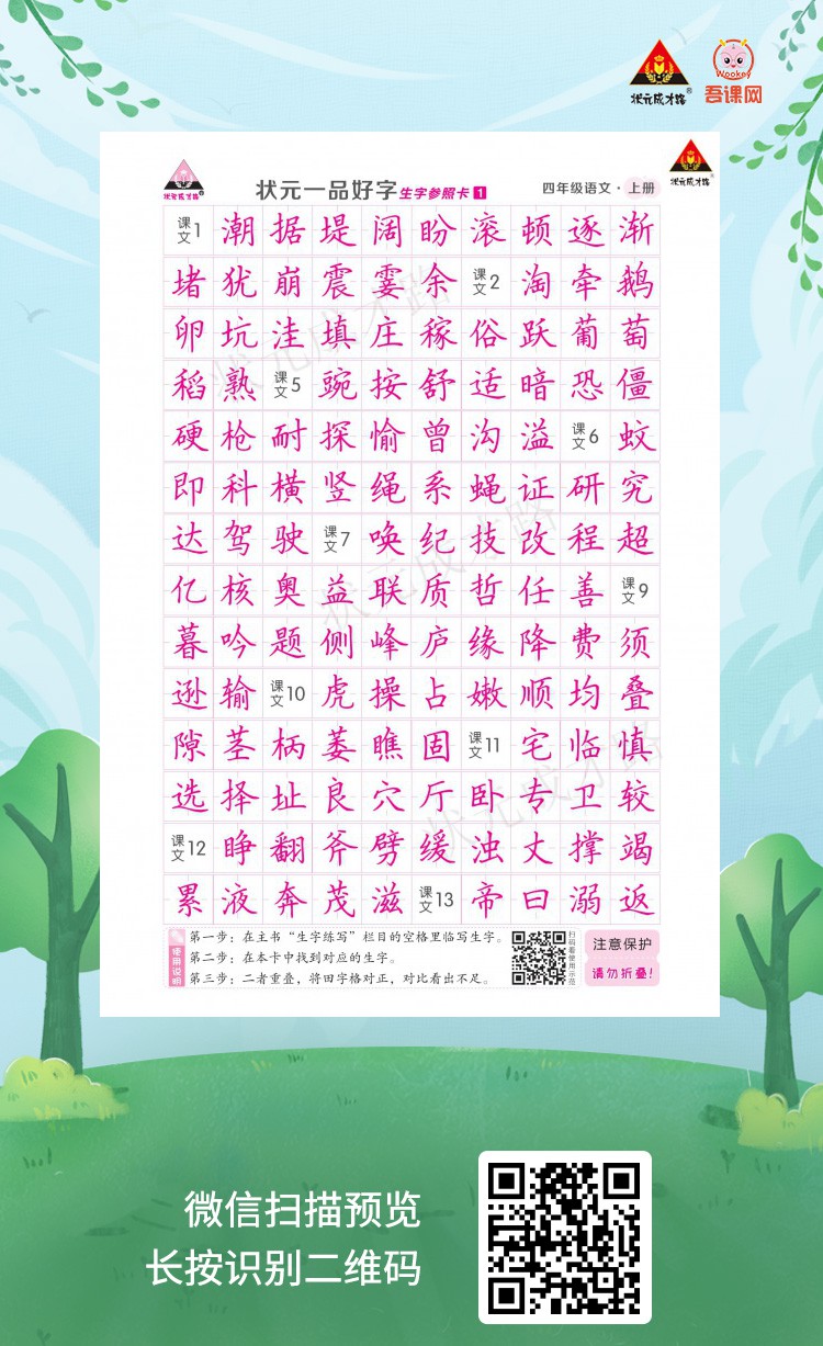 统编版四年级语文上册《状元一品好字 生字参照卡》